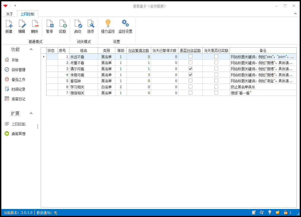 如果您在使用电脑工作时,总是控制不住自己去看那些喜欢的网站,结果耽误了工作的话,那么您可能需要“上网控制 ”功能。您可以在此功能中输入那些网站的名字,禁止的时间范围、暂停和奖励(和番茄钟结合)等,在输入完毕后再打开那些网 站,它就会立即关闭网站并弹出提示。此外,它还可以设置“强力监控”,也就是说,不到设定的调整时间,您是无法修改设置或 者关闭卸载软件的哦。