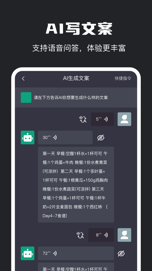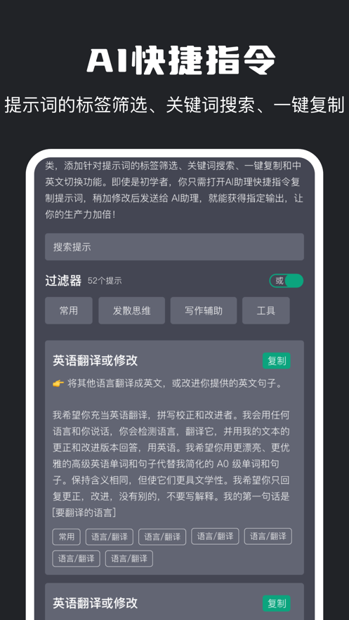 AI助理苹果版是一个智能助手服务软件,可以把你想做的事情都告诉AI机器人,然后会帮助你自动的完成,不论是写文章还是绘画还是翻译都可以满足你,任何的问题都会给你满意的回答,服务比较的周全,可以节省你很多的时间,让你轻松使用自己的手机。