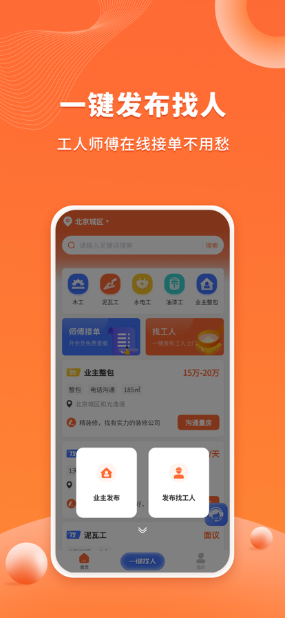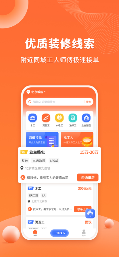 装修工人接单苹果版各种装修订单可以去接取,全部都是就近安排的,优质订单都会优先的给你提供,在线接单办公都很便利。