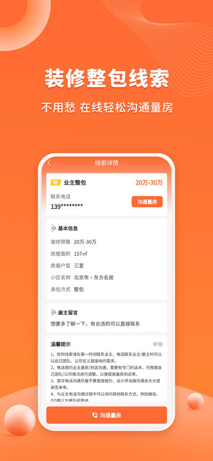 1、装修师傅直接可以在线上制定的接单,了解到每一个订单的具体信息。