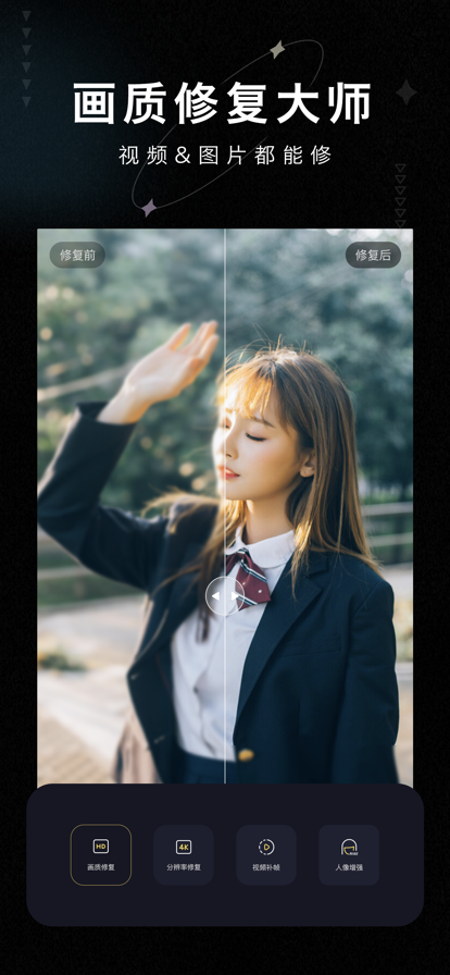 画质修复大师苹果版是一款画质修改软件,不管是视频画质还是图像画质都可以去修改,能有效的弥补光泽,各种模糊不清的画面都能一键修改为高清画质,让视频和画像看上去更加的清晰,还能调节视频的分辨率,图像内容可以自由去编辑和美化,效率很高。