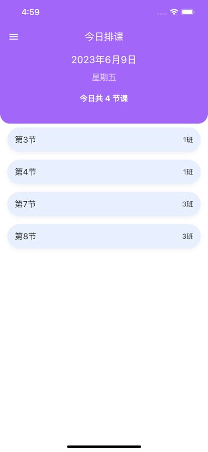 我的排课表苹果版是一个排课记录服务软件,每天都可以在线查看自己的课程信息,能自动为你生成排课表,所有的课程都能详细的查看到,只要输入自己的课程就能自动为你排课了,操作很简单,让你能清楚的知道下一节是什么类型的课,服务很周全。