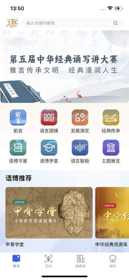 语博苹果版是一款读书语言服务软件,里面有多种语博知识可以去学习,各种朗诵大赛可以去观看,不管是当今的书籍还是历史书籍都可以去查看,还有很多古老的文字信息可以去了解,各种语博信息推荐,让你可以实时在线亲身体验各种甲骨文的互动感受。