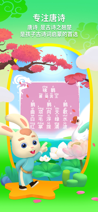 玄机兔点唐诗苹果版是一个唐诗学习服务软件,里面有很多种类型的唐诗可以去阅读学习,让孩子可以学会背诵各种唐诗,每种唐诗都有不同的背景照,而且都是动画类型的,可爱的兔子导师会像做游戏一样去指导孩子阅读唐诗,一边玩耍一边高效学习唐诗知识。