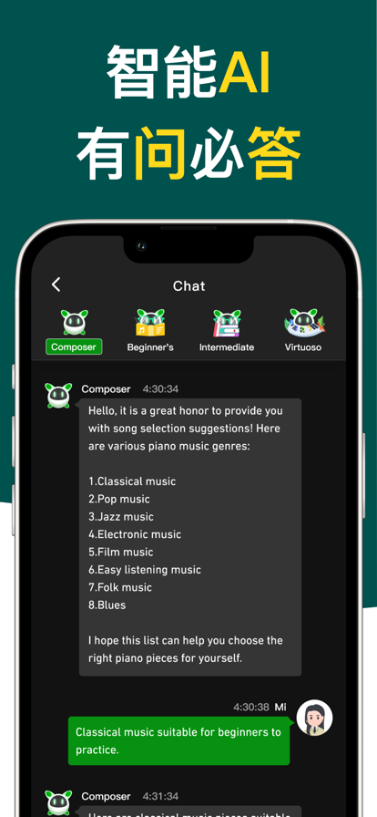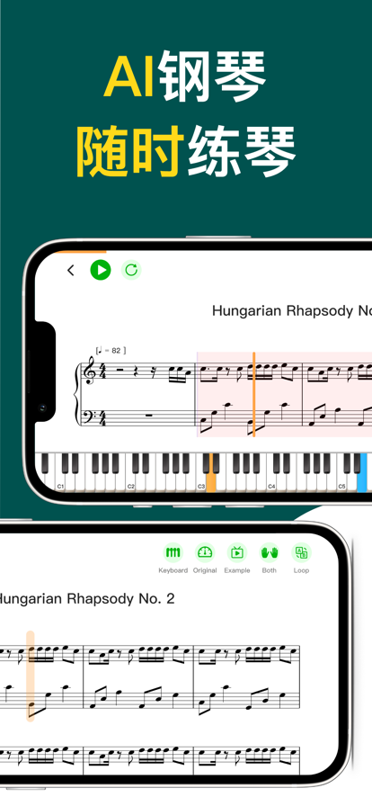 1.提供钢琴经典曲库,自由挑选喜欢的钢琴曲练习