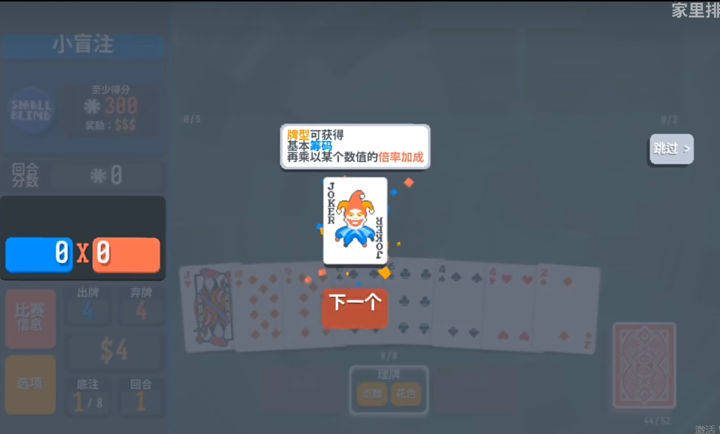 1. 核心循环:抽牌-弃牌-出牌:每轮初始抽取8张手牌,玩家需在有限弃牌次数内优化牌型(如同花、顺子、三条等),满足当前盲注阶段的积分门槛。例如,在“大盲注”阶段需组合出“四条”牌型并搭配小丑牌“四叶草”(提升四条倍率)以突破高分。