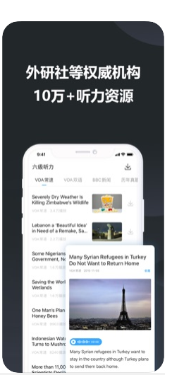 收录外研社、BBC、VOA、听力真题数10万权威听力资源,英美发音地道纯正,多场景听力练习。