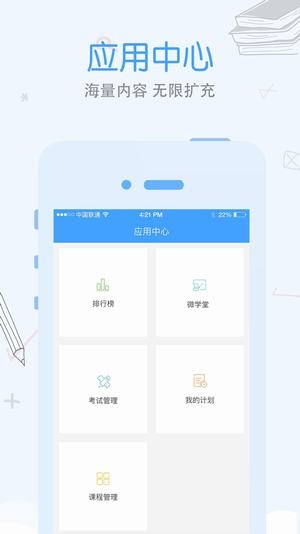 我的课程、我的计划、我的考试、课程超市、排行榜,所有功能尽在应用中心。