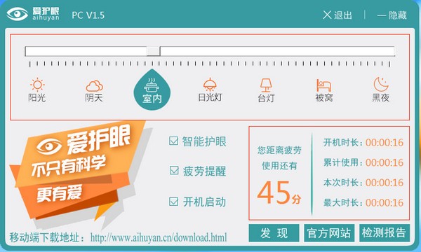 爱护眼是一款保护电脑前的你的视力的软件,爱护眼能够在用户使用电脑时自动调节电脑光亮度,使您的眼睛的疲劳得到缓解,保护视力,长时间工作在电脑面前的朋友可以试试此款软件。