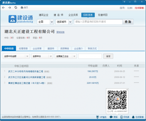 建设通是一款方便实用的建筑信息查询工具,提供全国建筑企业的中标信息,企业荣誉,资质等级,联系方式等信息的查询。