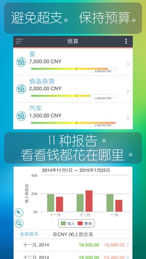 Moneywiz的报表功能相对旧版更加美观和实用,用户甚至可以自定义报表,根据自己的个性化需求选择报表显示的账户、类别、时间、报表类型等。