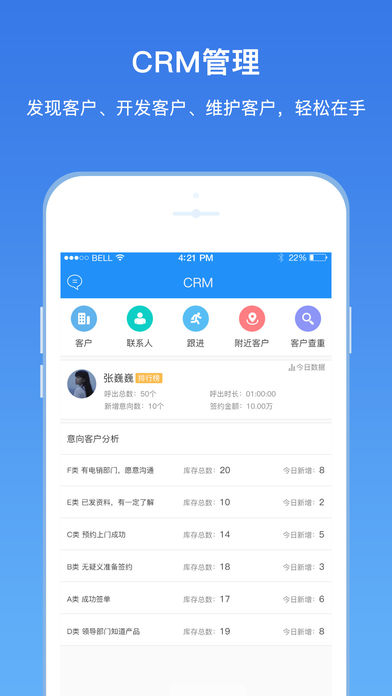 该软件是为商品营销工作人员服务的,你可以通过该软件实行客户管理,客户跟进,移动办公等功能。