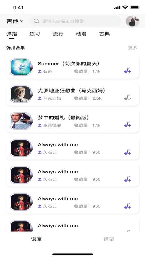 亿首琴谱的主要界面分别为谱库和谱架,用户根据需求可以自行选择曲谱类型,搜索到对应的谱子,谱架为用户收藏的曲谱,进入琴谱详情页可免费下载五线谱,并播放曲子轻松学音乐。