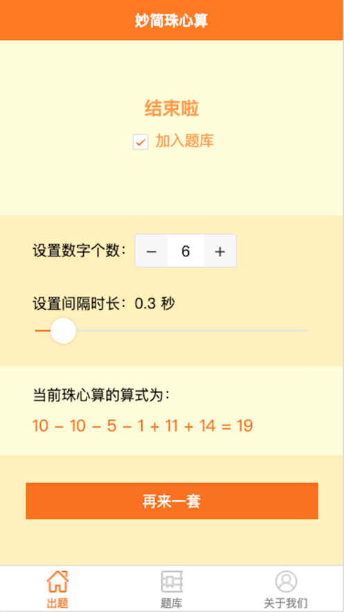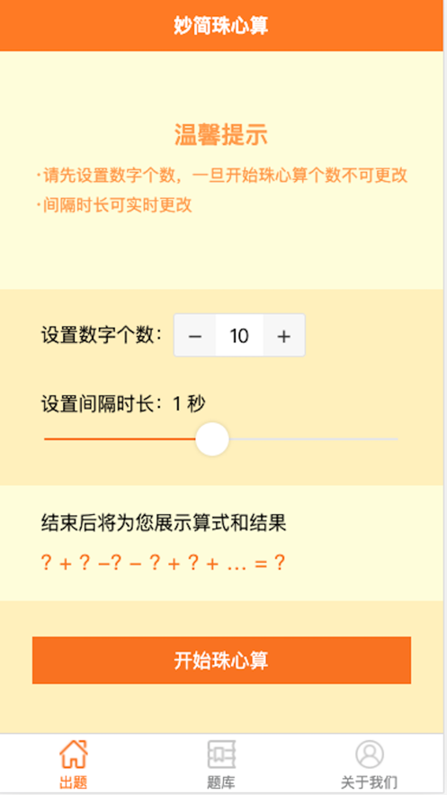妙简珠心算是一款优质的数学学习软件,这里为用户提供20以内加减算式,它能够根据所设数字个数为您随机出题,可调节间隔时间,可将较难题目加入题库,方便后续巩固练习。