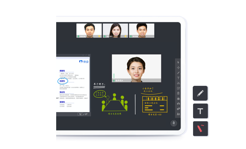 支持电子白板、屏幕共享、会议讨论、媒体共享、会议投票、文档共享支 持会议公告、操作控制、多种会议模板、会议录像、邀请人员参加、踢用户出会会议操作,会议与即时通讯无缝连接。