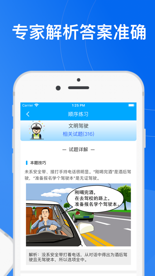 驾照宝典App是专为考驾照的用户开发的一款学习软件,通过它能够迅速提高相关的驾驶知识。如果你能合理使用这款软件,就能够轻松通过考试,拿到驾照,让用户驾考的题库一直属于最新题库,不错过任何一道题。助力考试一次通过。