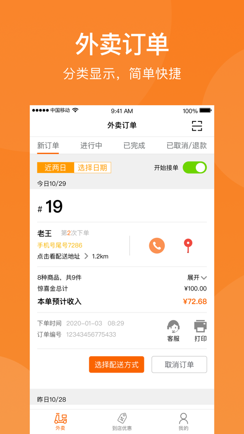 随时随地接单,待支付、待分拣、待配送等状态订单实时跟进,不错过一笔订单