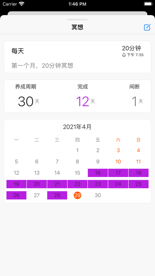 能设置习惯提醒功能,每天为用户提供完成习惯,在上面打卡;