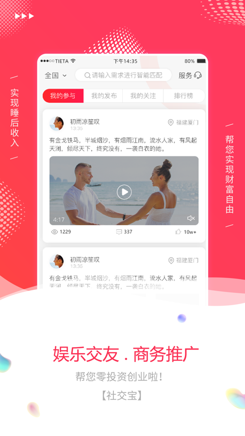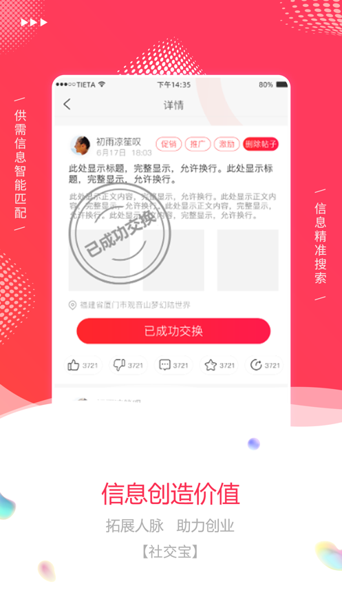 利用社交宝信息平台APP能够帮助用户们提升营销的效率,可以轻松获取更多的客源,也可以利用这款软件便捷推广自己的商品,如果这款软件能够对你带来帮助,快来下载试一试吧!