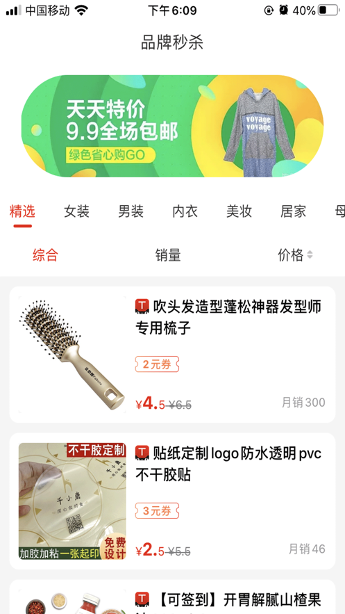 2、商城里的商品分类清晰明了,能够迅速的找到自己需要的商品,还有精选9.9包邮商品