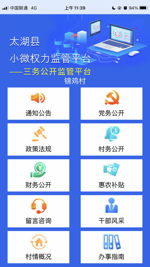 涵盖农村党建、村务、生活、社交、电商、金融等六大功能板块的综合服务管理平台;