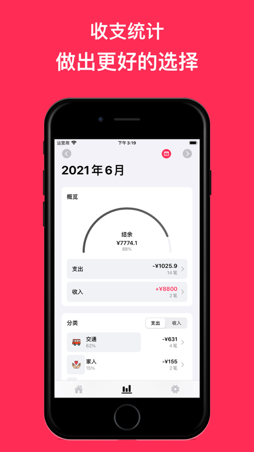 智能统计:线图饼图展现,清晰了解每周、每月收支构成