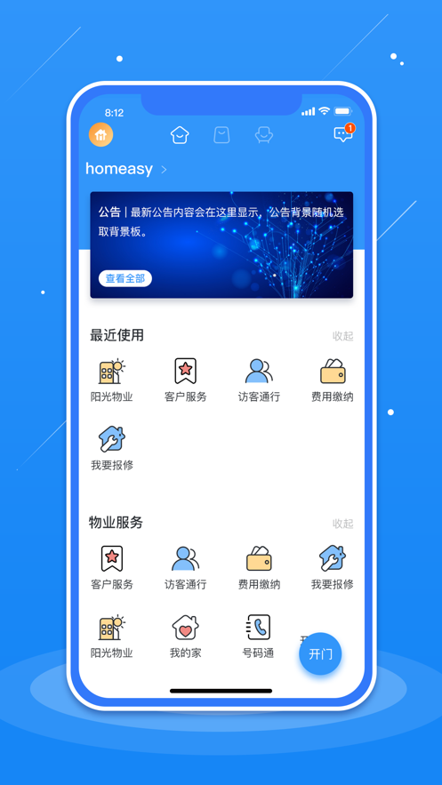 Homeasy回家吧APP能够实现业主足不出户了解小区公告状况,提供手机开门,在线报修,投诉建议,访客通行,养老服务,志愿帮扶,生活服务,通讯服务等快捷功能模块。