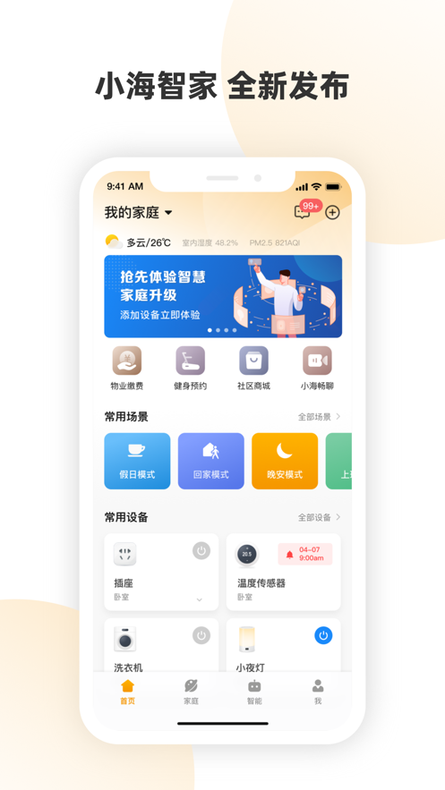 小海智家APP能够连接家里的各种智能设备,这样在远程控制的时候也更加方便,平台里面的各种功能丰富,也可以满足大家的需求,在手机上就可以控制家里的灯光以及空调等。