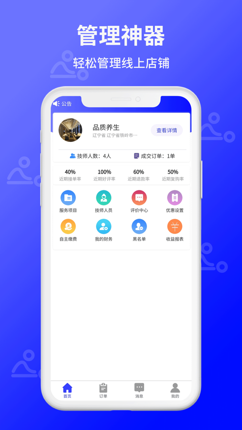 商家可随时了解店内技师工作状态,方便调配技师,同时可以发布不同的服务及套餐项目,技师可以随时更改自己工作状态,实时查看分配的单子及实时接受用户的单子,快约商户端APP的目标是为您打造一个更大更方便的工作管理平台。