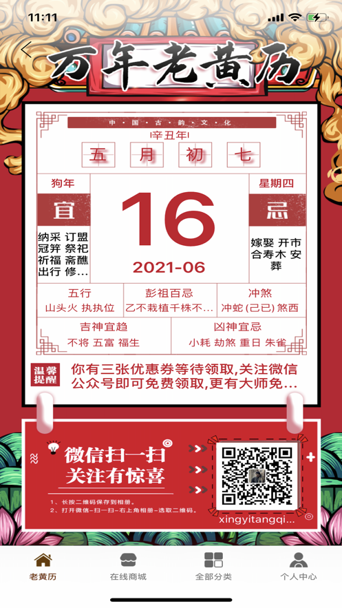 老黄历商城APP能为你提供黄历宜忌、择吉日、万年历查询、命理测算工具、天气预报、节日节气、精彩资讯、日程记事等实用功能。不负时光,给你好运!