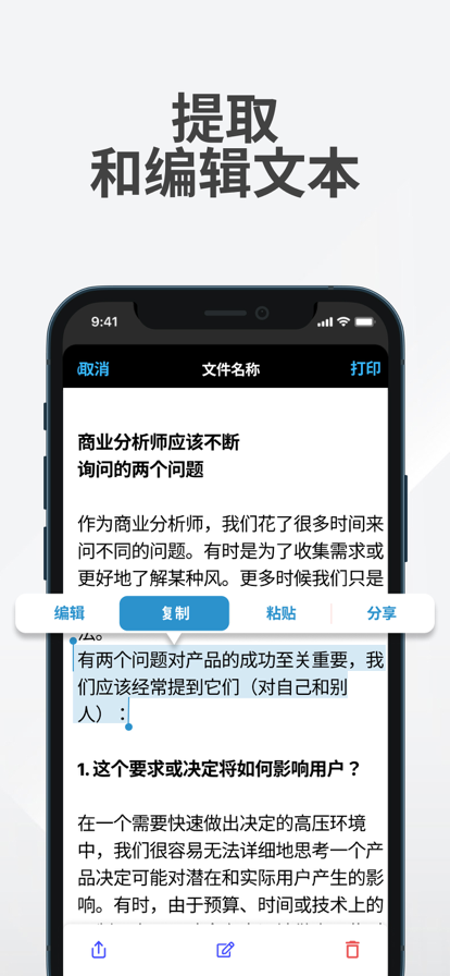 移动PDF扫描是一款功能相当强大的文件处理软件,在我们日常的生活中,无论是工作还是学习都离不开各种pdf文档,很多小伙伴对于如何提取文档当中的数据而感到头疼。这时候移动PDF扫描就能够给你最好的帮助,他能够直接通过摄像头拍摄的方式,直接读取文档当中的信息,并且精准转化成文字,让你摆脱文档提取的烦恼。
