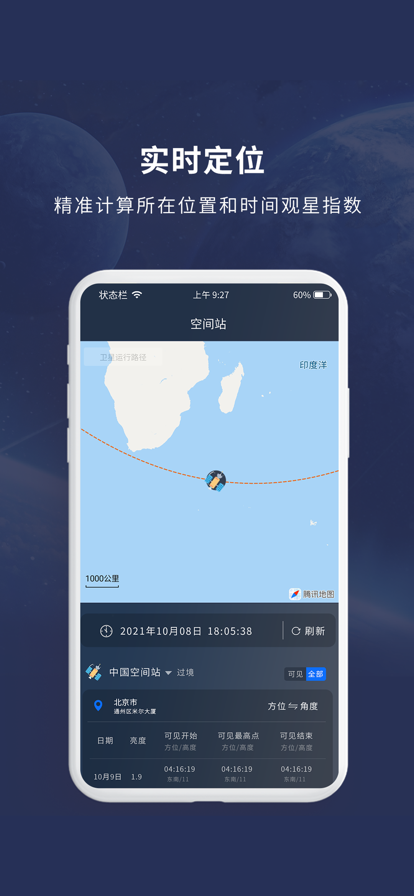 3.系统会进行实时定位,帮助用户进行计算所在的位置和观星指数。