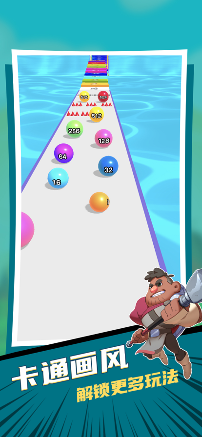 激斗2048是一个以2048为核心玩法的休闲手游,不过不同于传统的点击移动合成,这是一个跑酷类型的玩法设定,在游戏中我们需要控制自己的小球来不断前进,并且合成同样数字的小球来扩大自己的数值,不过要注意的是,只有同样大小的球才能够被我们合成,如果撞上了其他球就等于游戏结束了哦!