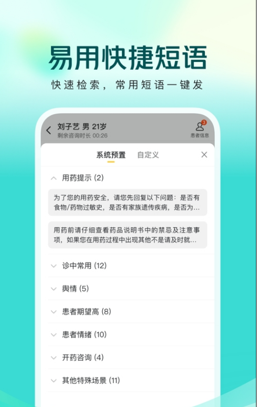 美团买药医生端苹果版是一款医患共用的医疗软件,最新消息可以及时的接收,患者有什么问题都可以在线询问医疗专家,及时确诊自己得了什么病,然后获取开药的方案,医生能够使用快捷回复方式来回复患者,医疗服务都很周全,随时可以在线互动。