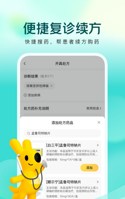 医生可以随时随地的添加处方药品,开具处方更方便。