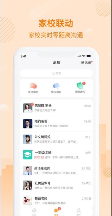 3、【家校互动】班级群聊,好友单聊,实现家校无障碍高效沟通。