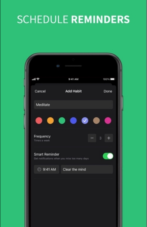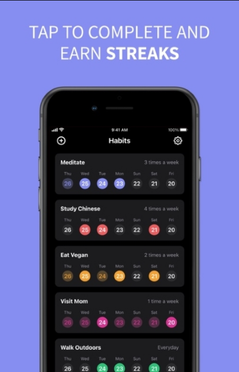 3、创建一个习惯,给它分配一个颜色,并通过点击相应的日子将其标记为完成。