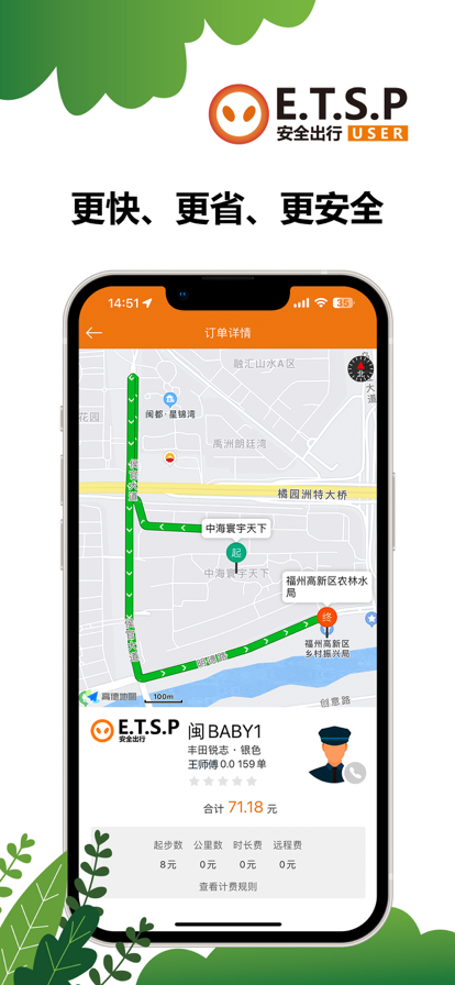 ETSP安全出行苹果版是一款出行服务软件,司机和乘客可以供用的出行软件,订单可以快速的接取,打车的速度非常快,出行都会有专业的导航系统,提供最佳的路线,打车非常的省钱而且还很安全,司机都是实名认证的,专业的语音提示,效率非常高。