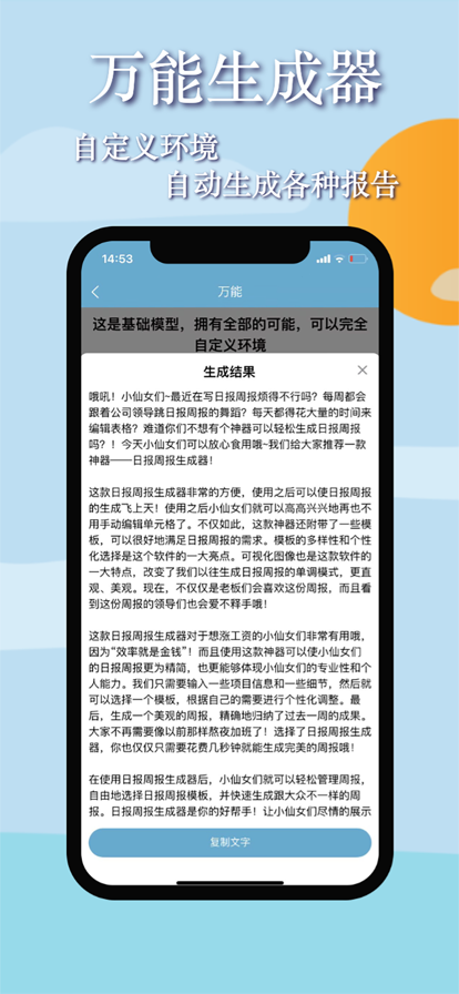 日报周报生成器苹果版是一款文章生成软件,各种类型的文章内容都可以自动的生成,信息内容可自由的去编辑,输入自己想要的信息然后点击生成就好了,效率非常的高,文字信息都已经自动的排版好了,一键就可以分享出去,工作汇报都能去生成。
