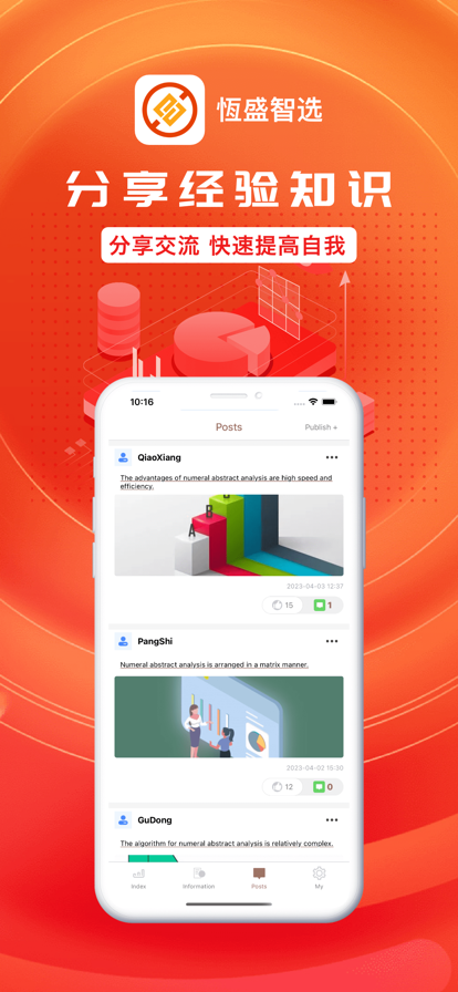 恆盛智选苹果版是一个数字抽象分析软件,里面覆盖了很多关于数字抽象分析的信息,全部都是免费提供的,用户想什么时候来资讯都是可以的,自己也可以去发布有些抽象分析的内容,对内容有看法或者有意见都可以发表出来,功能和服务都很周全的。