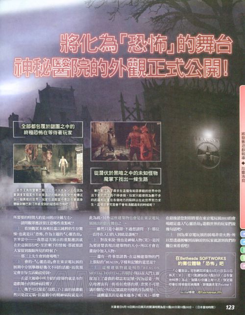 《恶灵附身》(The Evil Within),由三上真司一手操办的游戏,将使用id Software的Tech 5引擎。玩家将在游戏中扮演名为塞巴斯蒂安的侦探,其搭档死于一次血腥屠戮。塞巴斯蒂安亲临犯罪现场办案,结果误入一个充斥着邪恶怪物的世界。恶灵附身(The Evil Within)》将于2014年登陆PC、PS3、Xbox 360平台,以及下一代主机平台。三上真司领军的Tango Gameworks负责开发,Bethesda负责发行。《恶灵附身(Psycho Break)》是受到玩家瞩目的生存惊悚动作游戏,这次我们报道的是玩家将踏入恐怖世界的入口,也就是精神病院的设定美术。