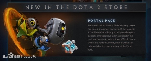 《传送门》里尖酸刻薄的GLaDOS终于在Dota 2的播音员中闪亮登场!善于讽刺的人工智能只怕会非常乐意告诉您兵营或者防御塔已被摧毁。大礼包中还含有全新的光圈科技核心守卫和《传送门》游戏界面皮肤,全部都是《传送门》大礼包独家拥有
