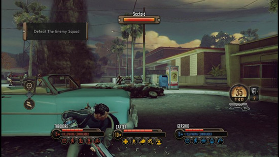 大卫思华会作为我方的狙击手与三人一同两面包夹中部的敌人,比较容易对付,但是尽量不要击中中央的爆炸桶,留待此后作用。