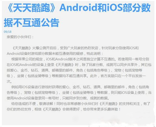 天天酷跑安卓和ios部分数据是不能互通的,也就是说同一个帐号,在两个不同系统的移动设备上登入游戏,除了玩家分数、成就同步共享以外,其他数据一律是没有互通共享的。