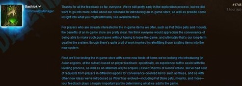 前不久,在暴雪美服战网论坛上的一位玩家发帖询问“5.4补丁中游戏内置商店提供的100%经验加成道具”是个什么东西?社区经理Zarhym回答到“我们目前正在探索为特定地区的玩家提供一种在游戏内直接完成交易的方式的可能性”,几句话可谓一石激起千层浪,让大家产生了魔兽世界似乎是要转型成为道具收费之类模式的错觉。