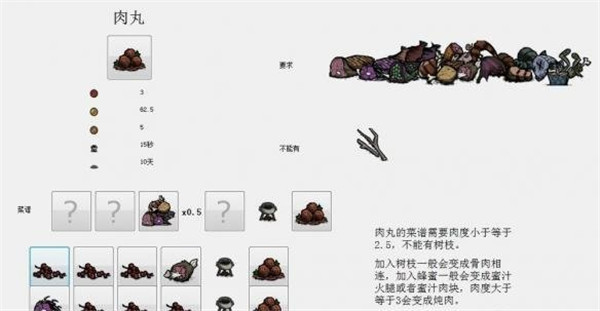 饥荒中实用度最高的菜品肉丸(如上图),可以看出烹饪是还是非常符合做菜的基本逻辑的?。