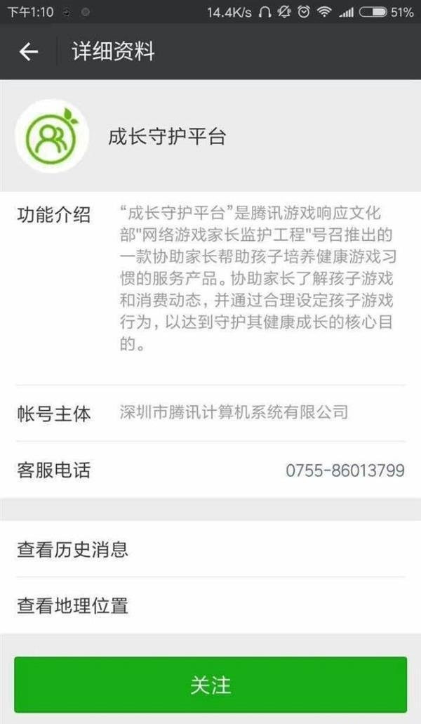 通过“成长守护平台”公众号,家长可绑定孩子(可关联两个孩子)的QQ号以及微信,即可查看孩子的游戏时间、消费记录,并可以设置禁止一些游戏,如果孩子不听话可以通过“一键禁止所有游戏”。(文末有图片介绍)
