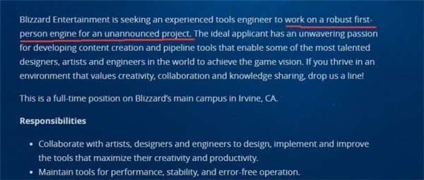 近日有网友发现,暴雪官方网站上多出了一项招聘启事,正在招聘一位经验丰富的工程师来开发一个第一人称游戏引擎。