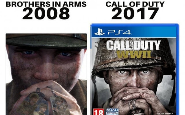 今天他在Twitter上连发了两张对比图,暗示《使命召唤14》的游戏封面是“抄袭”的当年Gearbox开发的二战题材射击游戏《战火兄弟连:地狱公路》(2008年发售)。