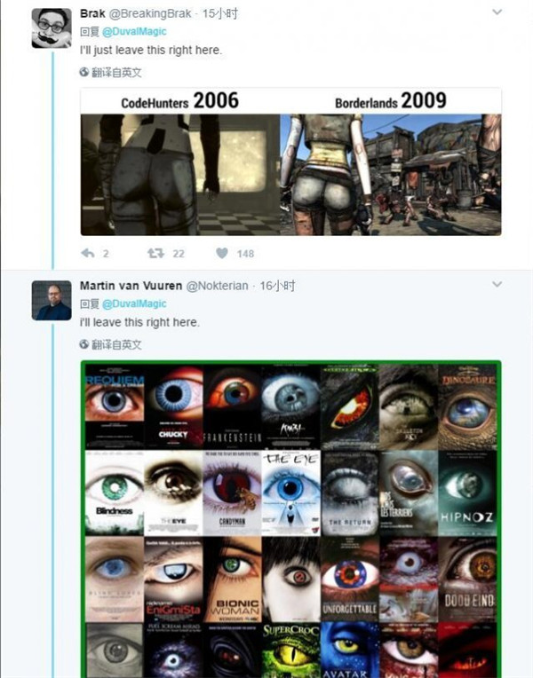 在游戏封面创作上,不排除这是“惊人的巧合”。尽管Gearbox很不高兴,国外玩家对Gearbox CEO也并不是很领情。尤其是下面这些国外玩家在Twitter上回击的图,不知道Gearbox做何感想。。。